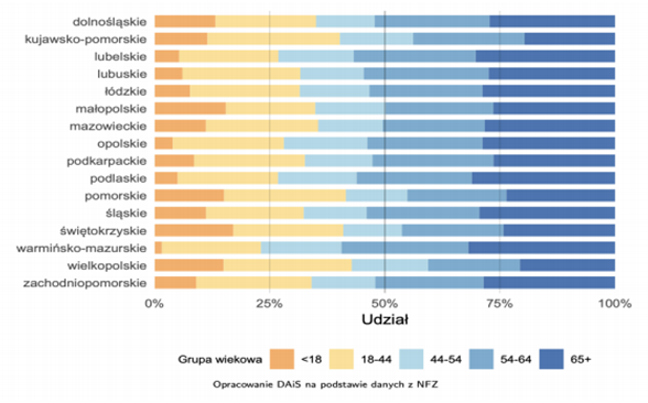 Borelioza dotyka wszystkich, niezależnie od wieku czy płci. Agencja Oceny Technologii Medycznych i Taryfikacji zebrała dane, które przedstawiają udział różnych grup wiekowych w zapadalności na boreliozę w poszczególnych województwach w Polsce. Dane za rok 2018 przedstawione są na poniższym wykresie: