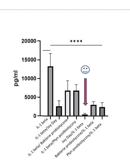 Badania były prowadzone z wykorzystaniem kultur komórkowych in vitro. Badano poziomy głównych elementów układu immunologicznego (IL8, TNF-α ) przed i po podaniu probiotyku. Model indukcji stanu zapalnego (występujący m.in. w przypadku infekcji wirusowych) uzyskano poprzez podanie cytokiny IL-1β do komórek Caco-2. Nasze probiotyki marki Joy Day wykazały działanie protekcyjne jak i lecznicze. Poziom IL-8 znacząco się obniżył w stosunku do poziomu IL-8 po podaniu samej IL-1β, co wskazuje na silne działanie protekcyjne Naszych probiotyków marki Joy Day. Wyniki zobrazowano na rycinie poniżej.